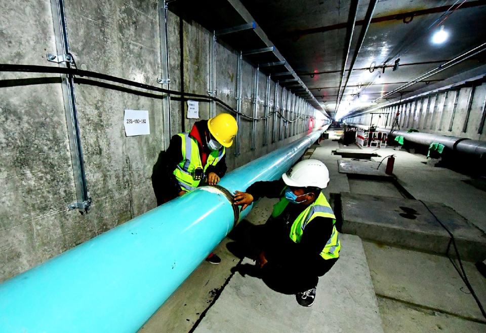 工作人員正在對(duì)文旅區(qū)地下管廊進(jìn)行日常維護(hù)。